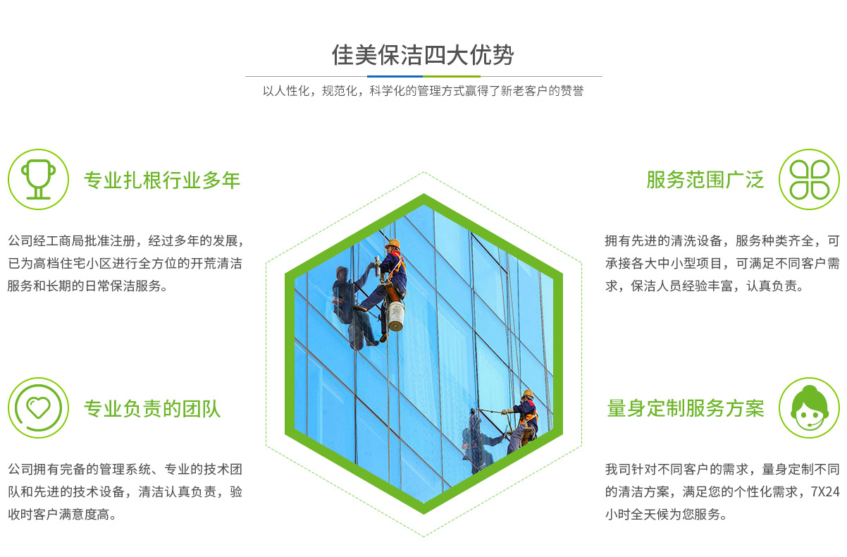 - 馬鞍山市佳美保潔服務(wù)有限公司是一家經(jīng)工商部門批準,具有法人資格專業(yè)清洗,馬鞍山保潔服務(wù)的公司,自創(chuàng)辦以來,一直致力于企業(yè),家庭,賓館,學(xué)校,別墅,酒店,商廈,公共設(shè)施等場所提供科學(xué)的日常保潔和清潔保護的服務(wù)公司,有著豐富的管理服務(wù)和保潔經(jīng)驗...